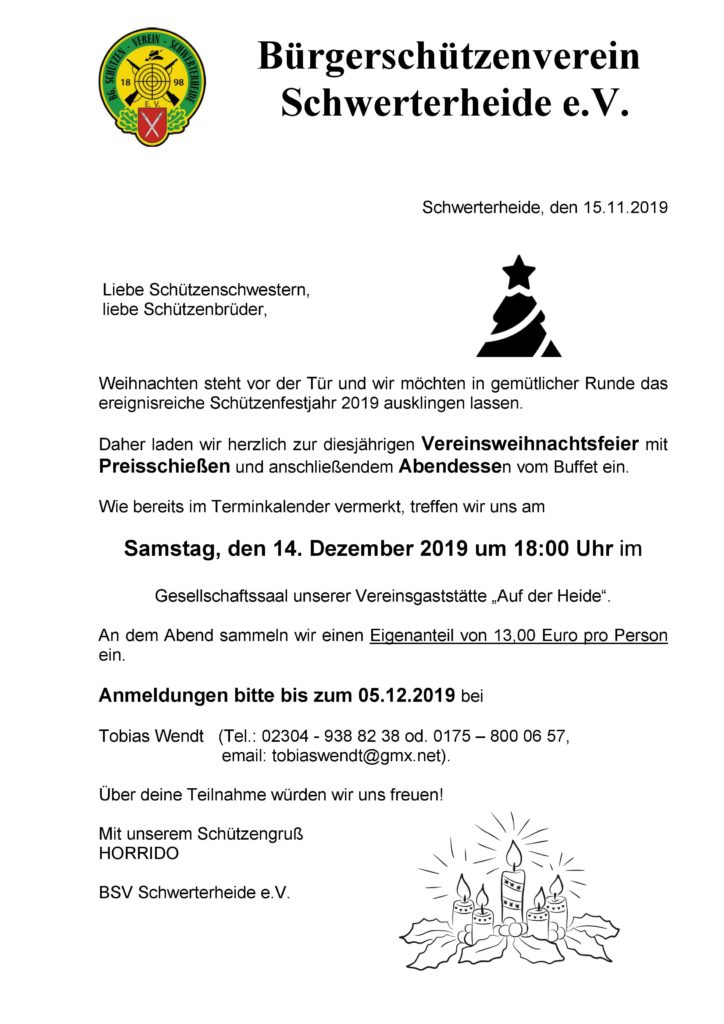 Am 14.Dezember 2019 findet unsere Vereinsweihnachtsfeier statt