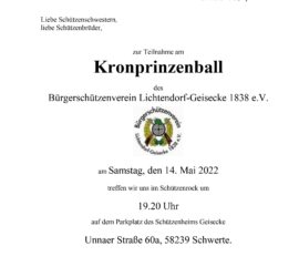 Der Bürgerschützenverein Schwerterheide lädt alle seine Mitglieder ein zum traditionellen Neujahrsempfang. Dieser findet statt am Sonntag, dem 13. Februar 2022 in der großen Schützenhalle an der Heidestraße 55. Beginn: 11 Uhr. Die Veranstaltung wird durchgeführt unter Beachtung der Corona-Schutzverordnung. Es gelten die aktuellen Regeln für Gaststätten: 2G plus oder geboostert. […]