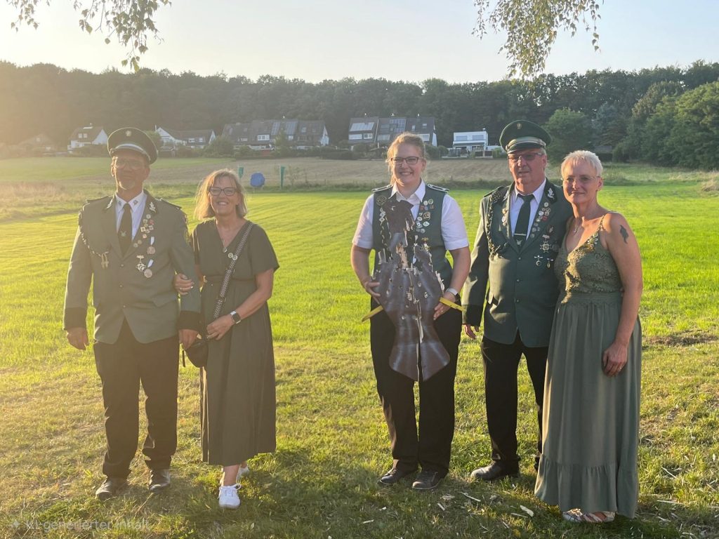 BSV-Königin 2024 – 2026 Désirée I. (Burk) nach dem Königsschießen. Sie wird in ihrer zweijährigen Regentschaft von den Adjutantenpaaren Rene und Melanie Galle (links) sowie Christiaan und Sabine Wachenfeld (rechts) begleitet.